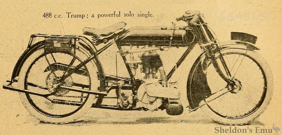 In addition to these models, Trump Motors, Ltd., Foxlake Works, Byfleet, Surrey, produce a fast twin-cylinder, which may be had either with the 770 c.c. J.A.P. engine (76 x 85 mm.) or the 976 c.c. (85.5x85 mm.) super-sports J.A.P. engine; the latter has a guaranteed speed of 80 m.p.h. This machine is also suitable for pulling a sidecar.