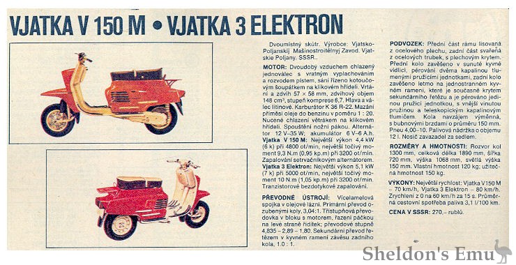 Manufactured at the Vyatskiye Polyany Machine-Building Plant in Vyatskiye Polyany between 1956 and 1979. The brand name was derived from both the river upon which it was located and a breed of horse native to the region. The first model, the VP-150, was a straight copy of the Vespa but with larger tyres and heavier bodywork. Some 300,000 of these were built before they heard Piaggio's shouts of cease and desist. It was replaced with the VP-150M in 1966 and was a ground-up redesign, and over a million were built. Production ceased in 1979, but sales of old stock continued until 1989.
