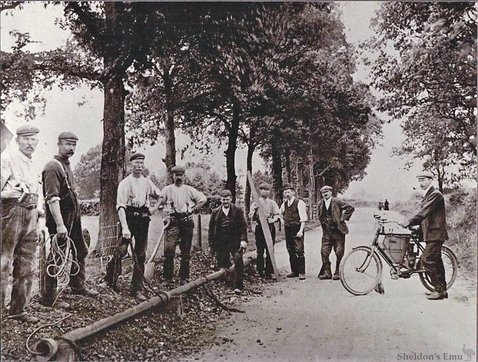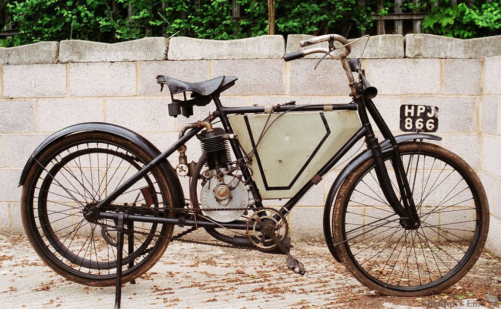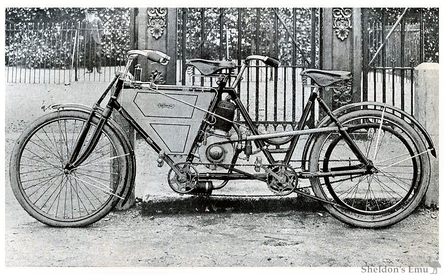 1900 The machine was a primitive fitted with a Belgian Kelecom or Antoine engine that was tucked into the space between the seat tube and the rear mudguard. The result was a reduction in the belt centres and enhanced belt-slip. The spark-plug was placed very close to the rider's thigh.