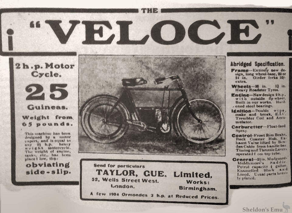 1905 Advertise the "Veloce" at 25 Guineas, and "A few 1994 Ormodes 3 h.p. at Reduced Prices". The Veloce had a 2hp engine and belt drive, but it was not a success and was discontinued. The company became Veloce Ltd.