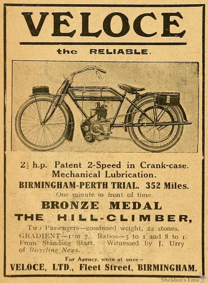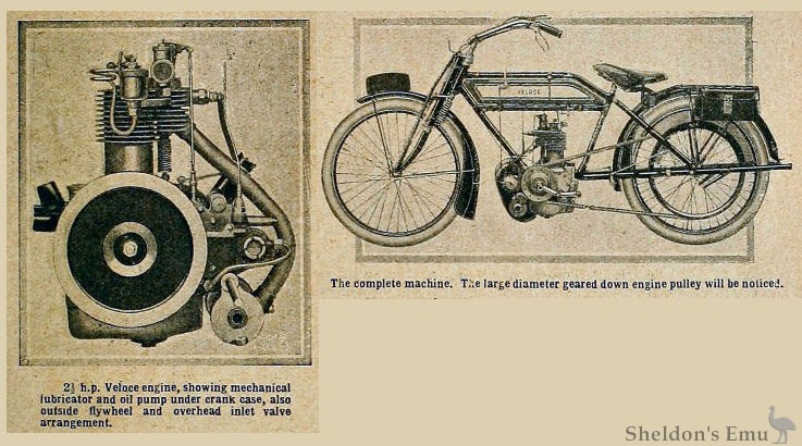 ...cyclists to learn that the well-known English firm, Veloce Limited, Fleet-street, Birmingham, have accomplished something in motor cycle construction that has never been hitherto attempted, and the success this firm has met with placing upon the market a reliable machine which overcomes the defects mentioned above promises to revolutionise motor cycling. For, in designing the V.M.C. engine and motor cycle, Veloce Limited have attained their object, namely, to provide a machine which can ridden and controlled in the thickest traffic without fear of damaging the gears when changing, or ruining the engine for want of lubrication. The makers have also guarded against excessive wear of belt due to small pulleys and short drive.