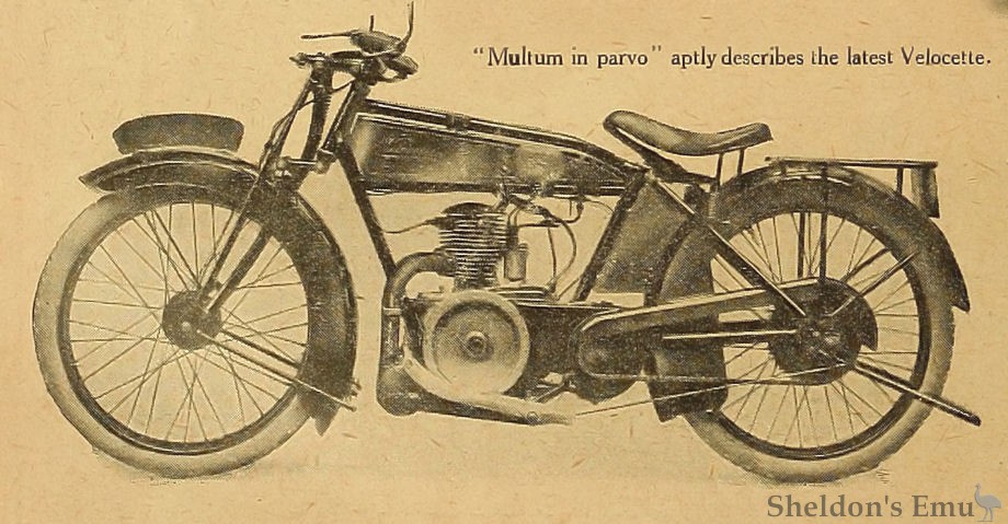 The Velocette engine has undergone radical alterations, and substantial advances have been made in respect of power output, silence, and balancing. The chief outward indication of these improvements lies in the exhaust system, twin pipes emerging from each side of the cylinder near its base, and leading into a large transverse silencer. Great pains have been taken to make all the joints in the exhaust system both sound and oil-proof. The public performances of this engine proved that in its old form it was exceptionally efficient; next year both its power output and its road manners will display further improvement. The remainder of the machine remains practically unchanged, though the new exhaust pipes have enforced alteration of the oil filler to a more convenient pattern. The weight of the three-speed model is still well under 180 lb., the two-speed model being proportionately lighter The sports model is fitted with a close ratio gear box. The engine of the latest machine is a development of the 1922 type of racing unit.