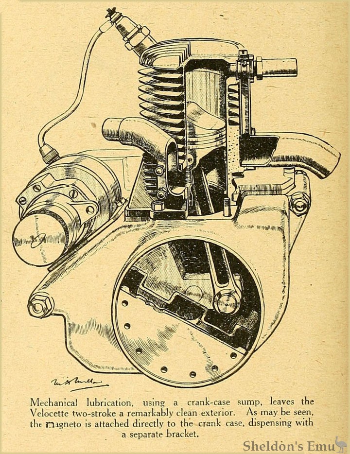Mechanical lubrication, using a crank-case sump, leaves the Velocette two-stroke a remarkably clean exterior. As may be seen, the magneto is attached directly to the crank case, dispensing with a separate bracket. (March 1922)
