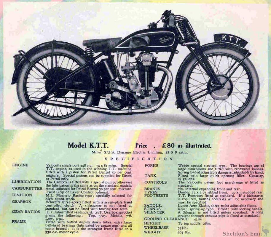 The well-known K and KE machines, which sold last year at £68 5s. and £61 respectively, have been combined, into a KN model at £62 10s. The frame of this is similar to that used on the 1928 KSS machine, having the extra large ball head and the curved under tank rail to facilitate cam-box removal. Similar to the KN, except that it has sports mudguards and a sports carrier, is the KNS. This also sells at £62 10s. The KSS is retained with minor improvements, but the price is now £70 only. This machine is capable of some 80 m.p.h. with an open exhaust. The new O.H.C. Velocette is known as the KTT and is an exact replica of Alec Bennett's winning T.T. mount. It can be obtained with an engine compression suitable for either petrol-benzole or alcohol fuels. The gear-box has the patented foot-change which proved so useful in the Isle of Man, and the saddle tank is fitted with the large junction pipe for quick filling. The price of this machine, which is very suitable for competition work, has been fixed at £80.
