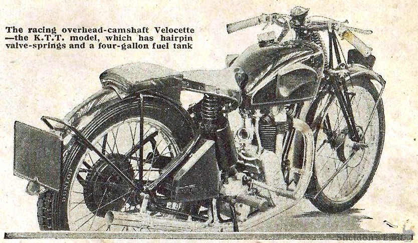 The racing overhead-camshaft Velocette - the K. T. T. model, which has hairpin valve-springs and a four-gallon fuel tank