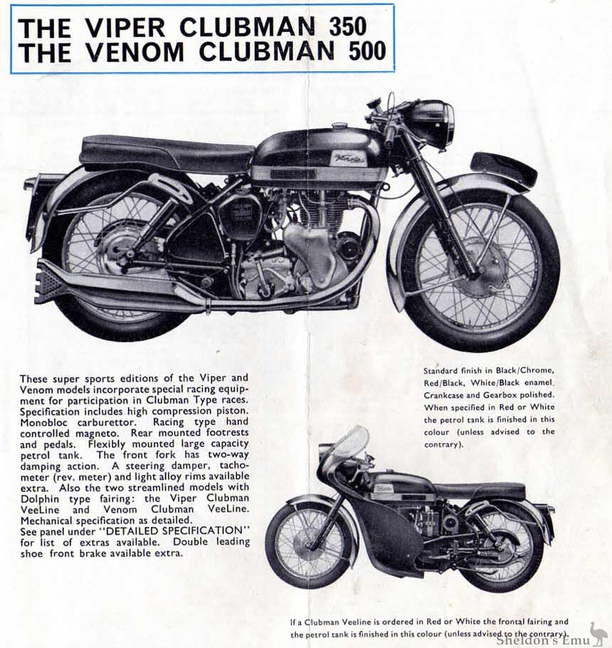 These super sports editions of the Viper and Venom models incorporate special racing equipment for participation in Clubman Type races. Specification includes high compression piston. Monobloc carburettor. Racing type hand controlled magneto. Rear mounted footrests and pedals. Flexibly mounted large capacity petrol tank. The front fork has two-way damping action. A steering damper, tachometer (rev. meter) and light alloy rims available extra. Also the two streamlined models with Dolphin type fairing: the Viper Clubman Veeline and Venom Clubman VeeLine. Mechanical specification as detailed.