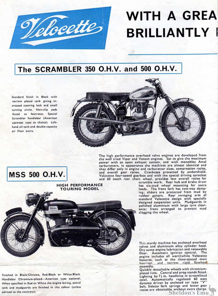 The high performance overhead valve engines are developed from the well tried Viper and Venom engines. Set to give the maximum power which an open exhaust system, and with monobloc Amal carburetters, in appearance the machines are almost identical and they differ only in engine and carburetter sizes, compression ratios, and overall gear ratios. Crankcase protected by undershield. Velocette four-speed gearbox and which the special driving sprocket and 60 tooth rear chain wheel, provides low overall ratios for scramble work. Rear hub and brake drum has six-stud wheel mounting for extra loads. The front fork has two-way damping; sliders are protected from mud by rubber gaiters. Rear swinging arm of standard Velocette design with specially designed suspension units. Mudguards in polished aluminium which large tyre clearance; front arranged co prevent mud clogging the wheel.