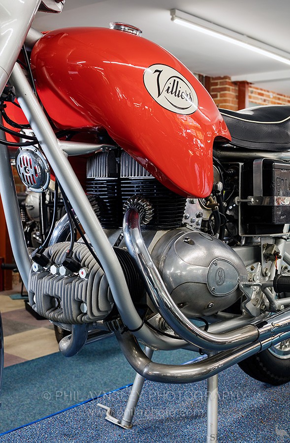El motor es una fusión, en formato de 'V', de dos de los muy respetados Villiers 2T bicilíndricos de dos tiempos, y su constructor utilizó tantos componentes estándar como le fuera posible, incluyendo todas las tapas superiores además de las piezas centrales del cárter y las tapas laterales.