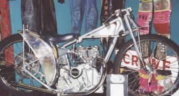 Grafted on to it was a cylinder head and barrel from a Rapide vee-twin shorn of most cooling fins. Like the pre-war Meteor and Comet singles the engine was mounted vertically. A duplex Pilgrim oil pump mounted externally at the top of the timing chest provided the unmistakable sign that it was destined for speedway use. The engine weighed 54 lbs complete with magneto and carburettor (16 lbs less than a JAP) and it is understood to have produced about 40 bhp.