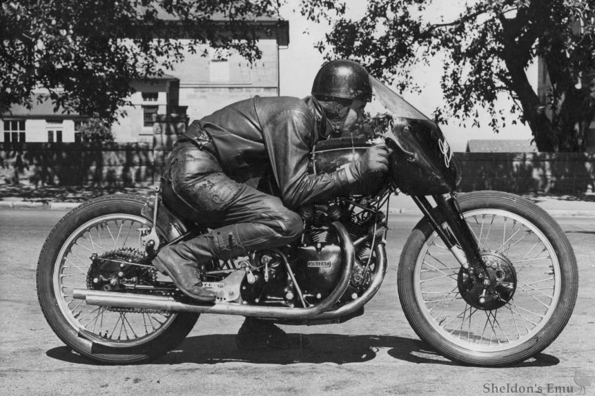 The machine was bought new in 1951 for £500. Jack was making £7.00 per week at his job in Garden Island naval base in Sydney Harbour, but he earned a good deal more than that racing speedway at Sydney Showground on Saturday nights and road racing on Sunday.
