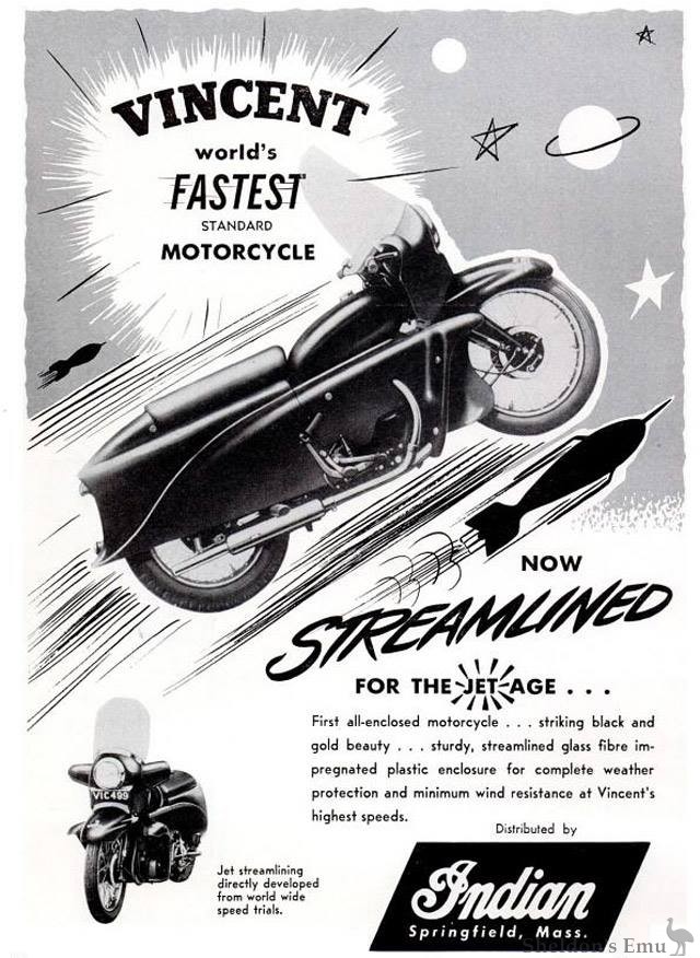 Falling sales of the Series C Vincent motorcycles during 1952 and 1953 was partly attributed to dated styling, so the firm sought to update the range and development began of what were to become known as the Series D machines. The main change was innovative full enclosure and weather protection, with glass fibre panels that included leg shields and a handlebar fairing. This was not about streamlining for speed, as the Vincent was already powerful enough for riders of the day - it was instead about the idea that the rider could travel to work in a suit rather than full motorcycle kit. Care was taken to ensure that the engines were still easily accessible for general maintenance, and the rear enclosure was hinged providing access to the rear wheel and drive chain.