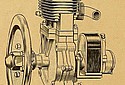 It had a special form of lubrication where the oil and petrol were kept separate, the former being distributed via a drip-feed lubricator into a plated brass well clipped to the down-tube on the Hockley. In this well was placed a ball-valve, which automatically regulated the supply of oil to the engine speed, the engine sucking the ball down according to its speed, while it remains up when the engine is stationary, so completely stopping the flow of oil. From this well the oil is distributed to the engine by three pipes; one leading to the cylinder and the other two to either side of the crank-case, where they feed directly on to the main bearings. The engine otherwise conforms to ordinary two-stroke practice. It is of 2.75 h.p., bore and stroke 70 x 70 mm., and the radiating fins continue to the bottom of the cylinder. Two exhaust pipes are provided, which emerge into a well-made cast aluminium silencer.