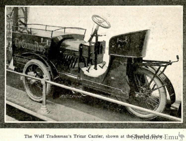 The front wheel brakes are worked by the driver's left foot. On the particular machine shown, a very large front seat was fitted to accommodate two people. The Wearwell Motor Carriage Co. are also making a speciality of tradesmen's carriers for this year. The Wolf motor bicycles have not been altered to any great extent, with the exception that we noticed that one model shown was fitted with Bowden handle-bar control.