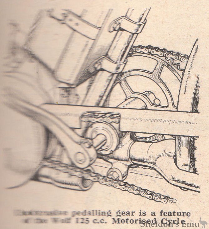 ...pedalling gear is a feature of the Wolf 125 c.c. Motorised Cycle