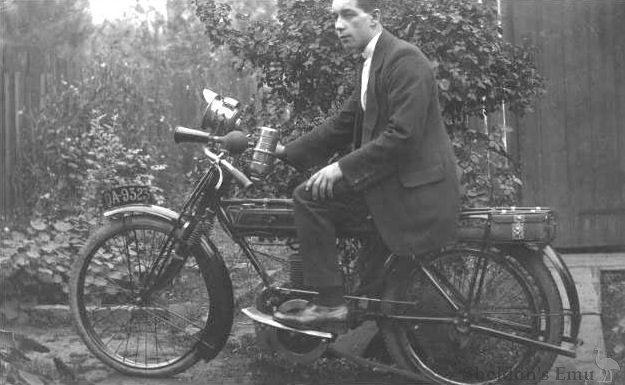 1924 - That model continued and was joined by a true lightweight motorcycle known as the Colonial model. It had a 130cc version of the same engine, two-speed Burman gearbox, all-chain drive and 24-inch diameter road wheels. Later in the year, either a 147cc Villiers or Aza two-stroke engine became an option.