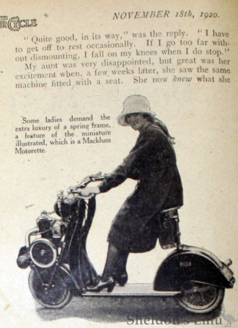 "Quite good in its way" was the reply. "I have to get off to rest occasionally. If I go too far without dismounting, I fall on my knees when I do stop." Some ladies demand the extra luxury of a spring frame, a feature of the miniature illustrated, which is a Macklum Motorette.