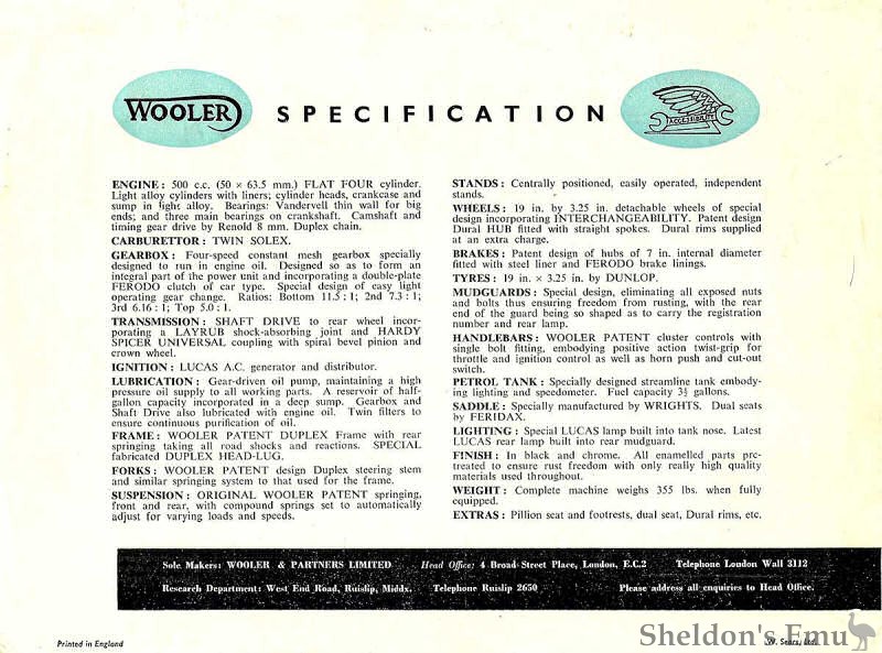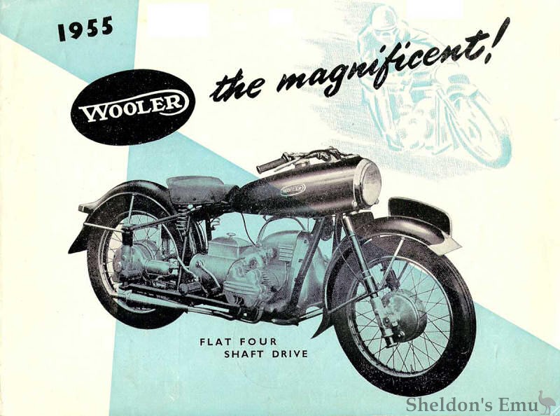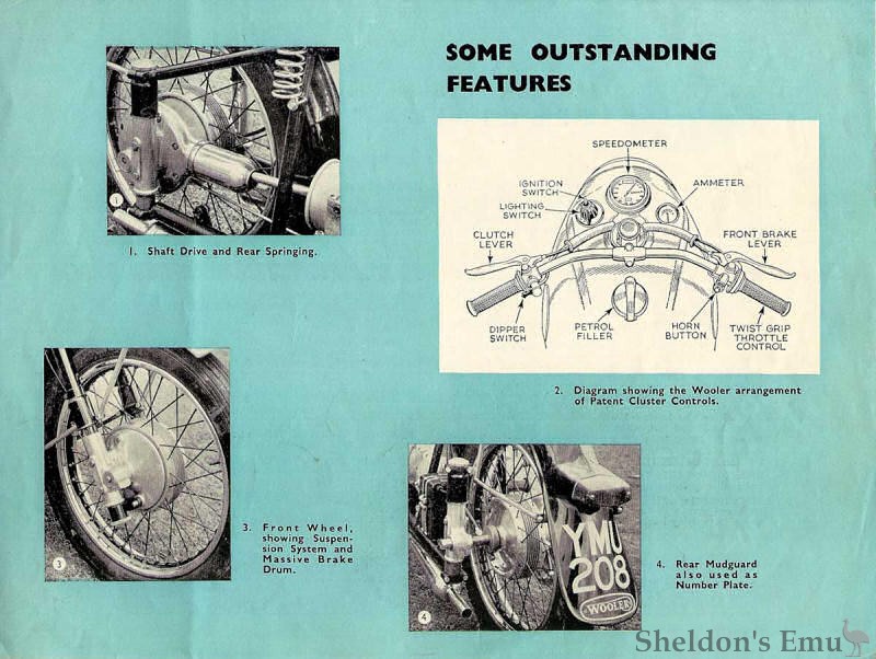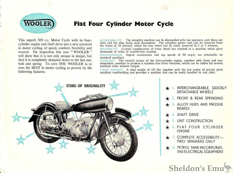 This superb 500 c.c. Motor Cycle with its four- cylinder engine and shaft drive sets a new standard in motor cycling, of speed, comfort, flexibility and control. On inspection this new "WOOLER" will show that it is not only unique in design, but that it is completely designed down to the last nut, bolt and spring. To own THE WOOLER is to own the BEST in motor cycling as proven by the following features: