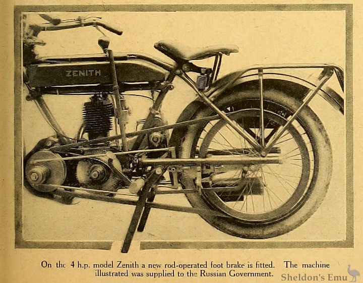 On the 4 h.p, model Zenith a new rod-operated foot brake is fitted. The machine illustrated was supplied to the Russian Government.