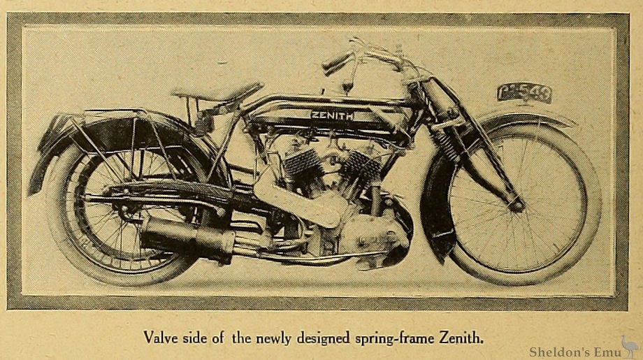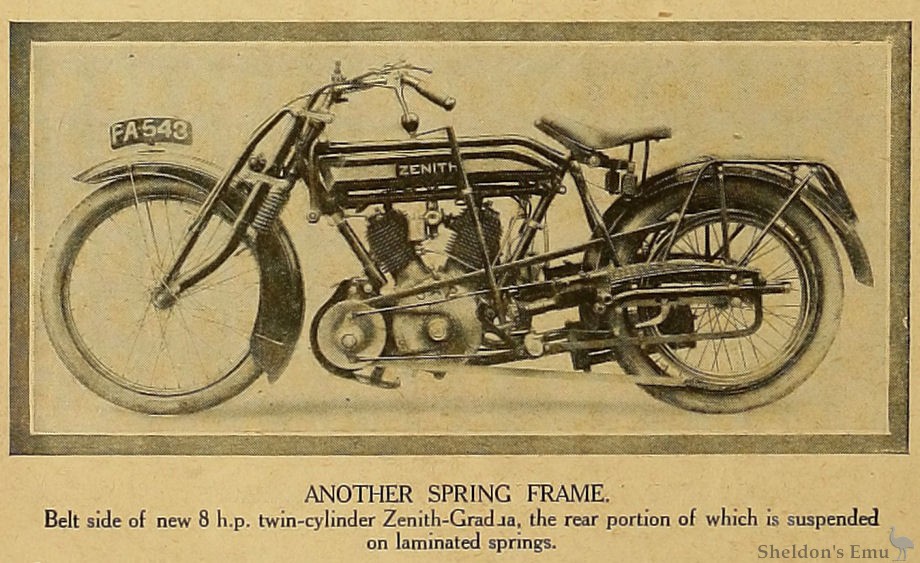 Belt side of new 8 h.p. twin-cylinder Zenith-Gradua, the rear portion of which is suspended on laminated springs.