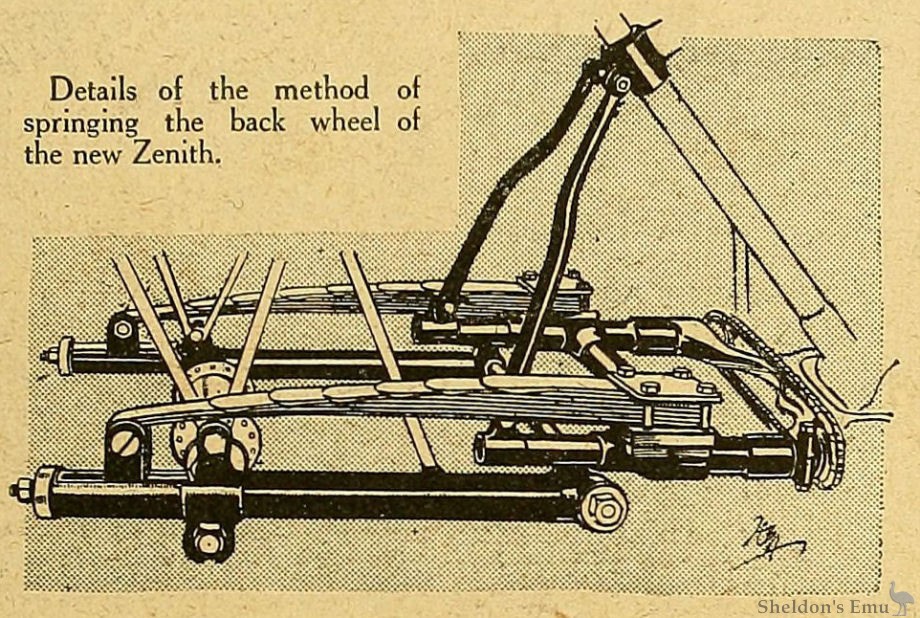 Great improvement in appearance has been brought about by fixing the mudguard stays, mudguard, and carrier to the movable portion of the frame, so that they all move in unison with the wheel, and consequently there is not that ugly gap between the rear mudguard and the wheel at present to be seen in the Zenith when the highest gear is in engagement.