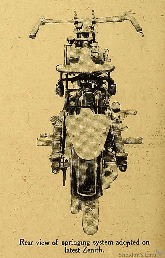The idea was ingenious, and worked well, but the design in those early days (1908) was crude. The new Zenith spring frame follows the very latest practice, is simple, by no means unsightly in appearance, and most effective. Two long leaf springs are employed, the forward ends of which are attached to the rigid portion of the frame, while the rearmost ends are attached to brass plungers sliding in the tubes of the movable portion.