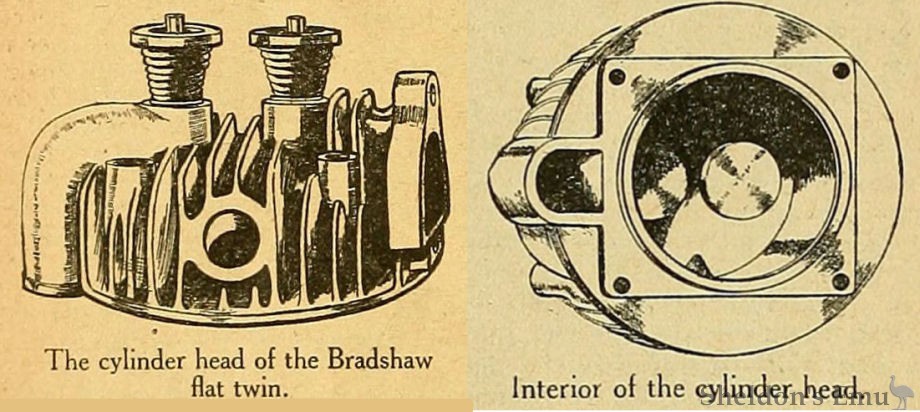 As might be expected, the new engine from the hands of Mr. Granville E. Bradshaw is full of very interesting features. Mr. Bradshaw is nothing if not original, and in the design of the medium-weight engine under consideration he has certainly excelled himself. There is nothing freakish in the engine, yet it is full of originality. His aim has been to produce the highest possible power for the engine capacity, and, notwithstanding the many special features, manufacturing possibilities have not been ignored. Mr. Bradshaw has worked on the theory that the air-cooled engine is in effect largely an oil-cooled engine, and therefore if the engine is to be kept cool the lubrication system requires special attention. Recent experiments have proved that the amount of heat dissipated by the crank case is relatively large, and Mr. Bradshaw has set out to keep the crank case cool and to keep the pistons cool, and claims that, having done this, a considerable step towards perfection in air-cooling has been taken.