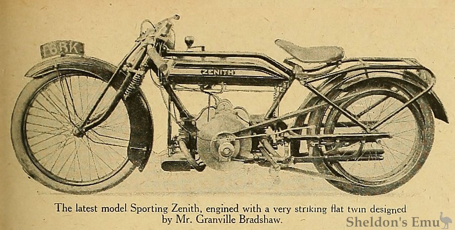 The latest model Sporting Zenith, engined with a very striking flat twin designed by Mr. Granville Bradshaw.