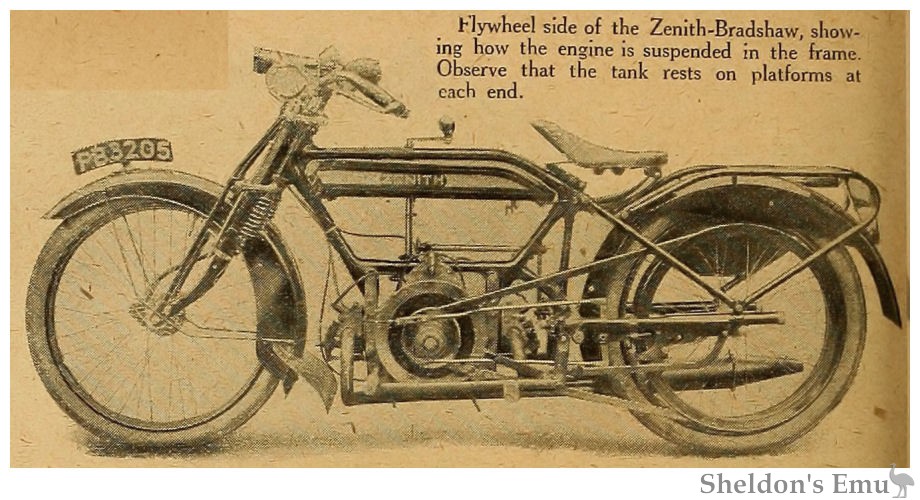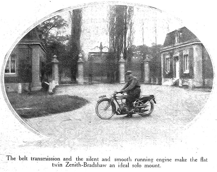Readers who lament the decease of the old-fashioned belt-driven sports mount should not fail to examine the Zenith-Bradshaw. It offers a better performance than its predecessors with a tremendous advance in road manners and refinement, although it weighs more than they did, and has a somewhat more complicated power unit.