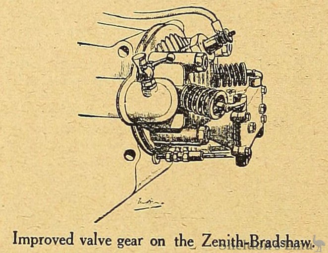 Little change has been made to the Bradshaw model, which was the first make to which this type of oil-cooled engine was fitted, and which is still the only one to use the flat twin version. The rocker gear, however, is now enclosed and wick-lubricated.