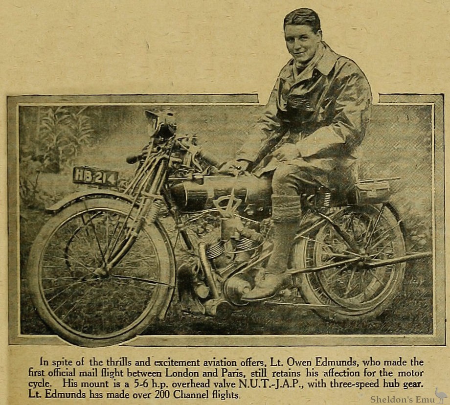 "In spite of the thrills and excitement aviation offers, Lt. Owen Edmunds, who made the first official mail flight between London and Paris, still retains his affection for the motor cycle. His mount is a 5-6 h.p. overhead valve N.U.T.-J.A.P., with three-speed hub gear.