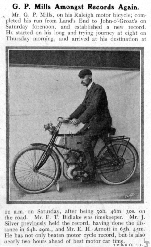 June 1904. Motorcycle record for Land's End to John o'Groats in 50h. 46m. 30s., beating previous records held by J. Silver and E. H. Arnott. George Pilkington Mills