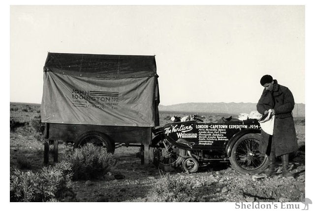 It took some talking to encourage Phelon & Moore to come aboard. P&M had supplied the army during the first war and it is possible that Campbell, who had been a despatch rider, had an association with them. The Panther 600cc Model 100 Redwing was an ideal sidecar hack, and the P & M workshops developed a specially reinforced machine aptly named "Venture" for the harsh conditions of the desert. The sidecar was by Watsonian and the combination pulled a large trailer.
